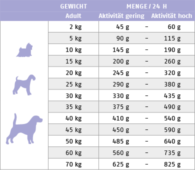 Fütterungsempfehlung für adulte Hunde pro Tag:
