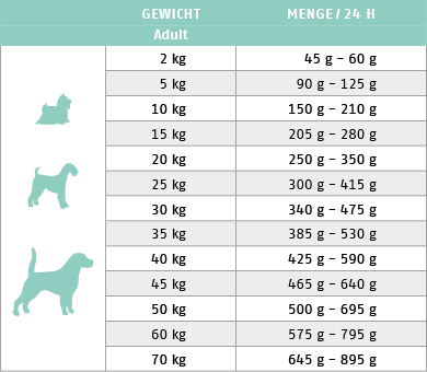Fütterungsempfehlung für adulte Hunde pro Tag: