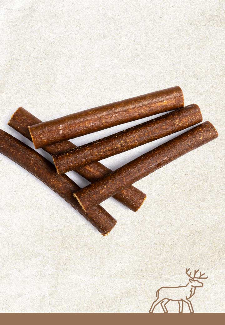 Kompakte Kaurollen aus Hirschfleisch. Die circa 13cm langen Rollen mit einem Durchmesser von bis zu 2cm können von kleinen Hunden ausgiebig gekaut werden und sind für größere Rassen ein willkommener Snack.